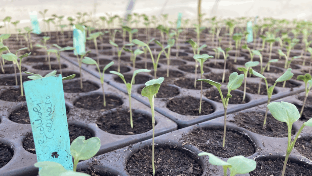 In der Anzucht sind die kleinen Pflänzchen vor dem Frost bestmöglich durch beheizte Tische und Luftpolsterfolie geschützt, sodass dort bei Sonne schnell Temperaturen von bis zu 30 Grad erreicht werden. Dann heißt es: Lüften! Hier sieht man bereits, worauf wir uns freuen können: Brokkoli, Spitzkohl, Wirsing, Staudensellerie, rote Bete und verschiedene Salate sind ausgesät und können bald in die Folientunnel gepflanzt werden.