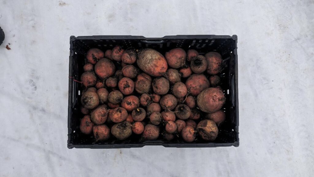 In unserem Lagerkeller lagern aktuell vor allem rote und gelbe Bete sowie Kartoffeln und einige Rüben. In den Häusern wächst der Postelein unermüdlich, außerdem stehen dort seit dem Herbst noch Rauke und Petersilie, die jedoch noch einen Wachstumsschub brauchen, bevor sie bereit für die Anteile sind.