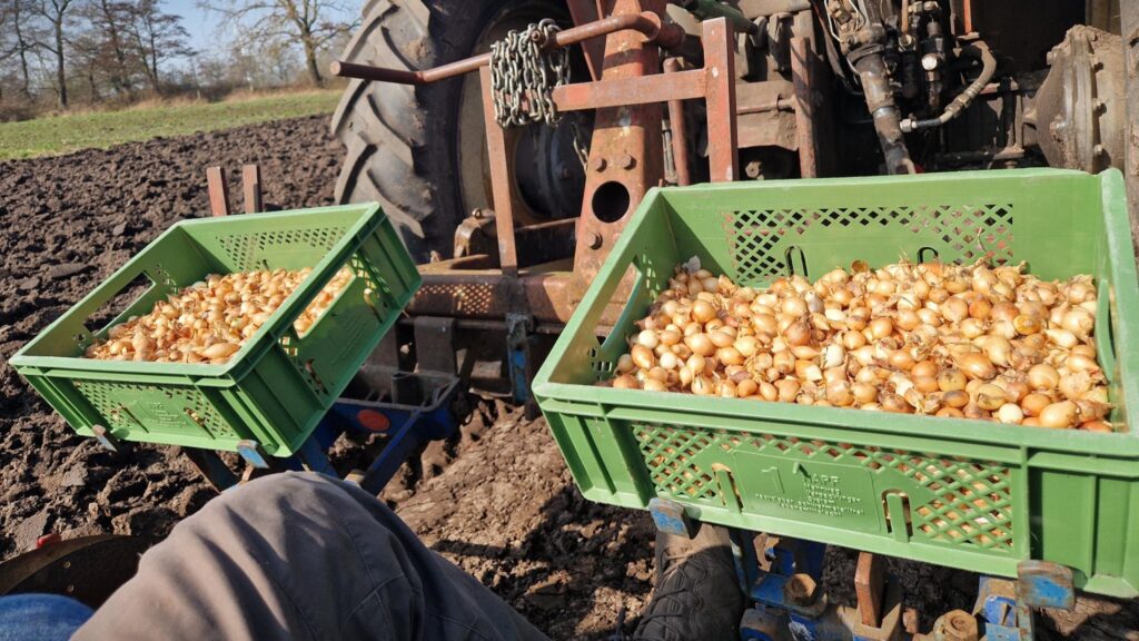 Die ersten Sonnenstunden haben wir zudem genutzt und schon die Zwiebelnim Boden! Auf der trockenen Hälfte des Ackers waren Pflügen und Überfahrt bereits möglich, das freut uns sehr und wir sind schön früh dran mit den Zwiebeln. Dieses Jahr haben wir uns entschieden, nur die gelbe Zwiebel Sturon anzubauen, da sie mehr Ertrag bringt als die rote, die wir letztes Jahr hatten und weniger häufig in Blüte geht.